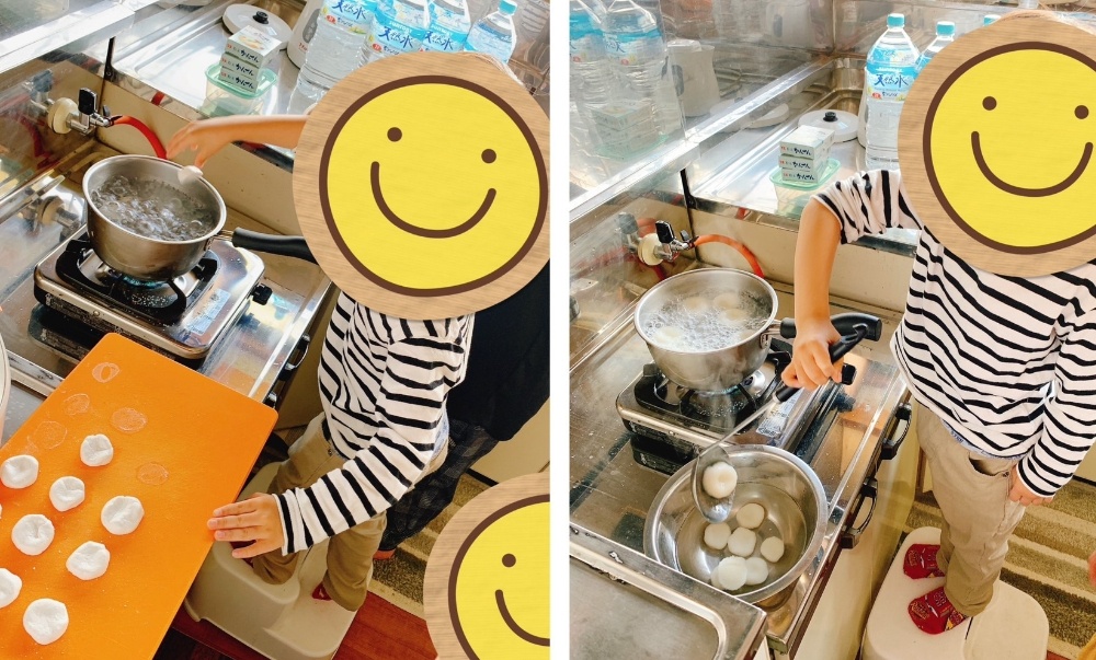 出来上がった白玉を沸騰したお湯に入れます。浮いてきたらお玉ですくう♪手と目の協応(^o^)