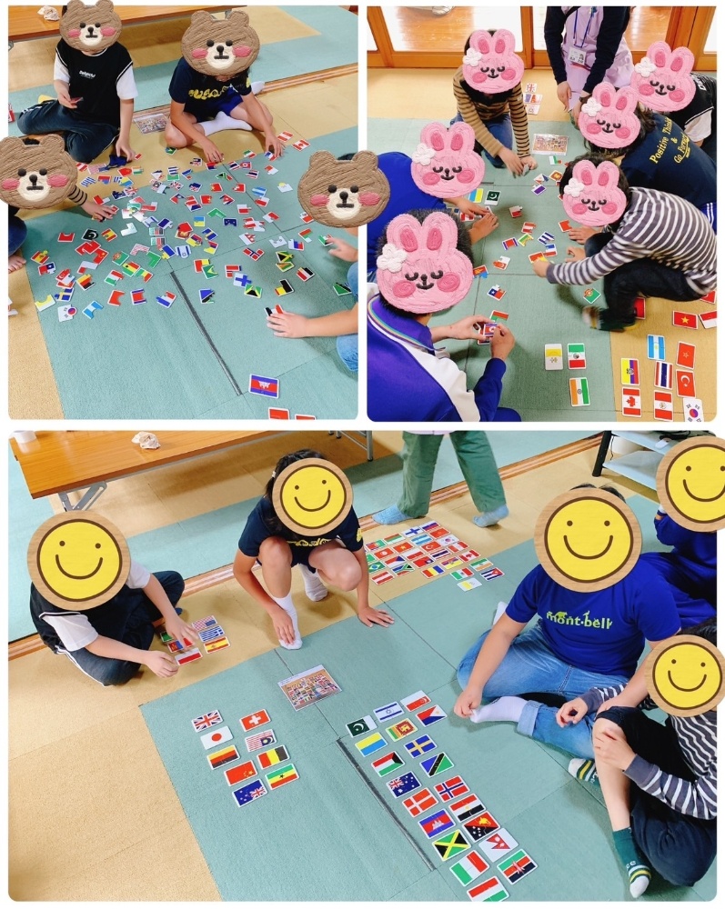集団活動では、『世界の国旗パズル』を。集中力、空間認知能力、他者意識をしながら取り組みました。