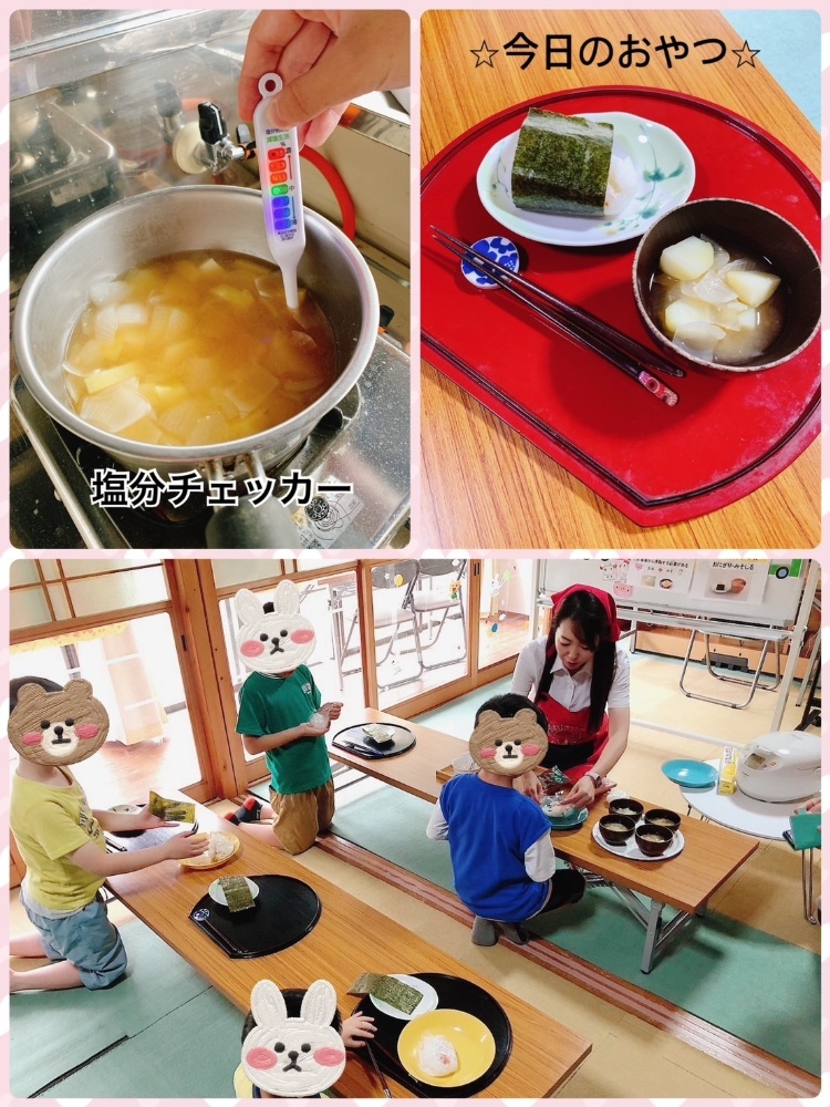 今日のおやつは、からだに必要不可欠な「必須アミノ酸」を取り入れたおにぎりと味噌汁をみんなで作りました。