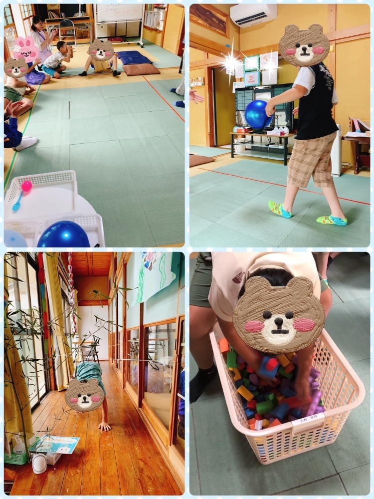 ①片足立ち→前転→座布団移動→ボール運び→ゴムくぐり→指令書を探し宝物をゲットする