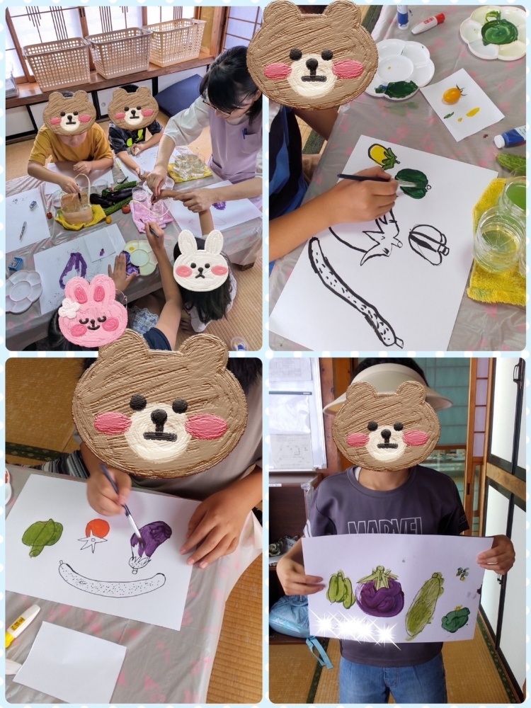 アート活動では『三原色』を使って夏野菜を描きました。青赤黄色を元に、3色だけを使って色を混ぜ合わせて色彩を表現(*^^*)子どもたちの素晴らしい感性が見いだせた活動になりました。