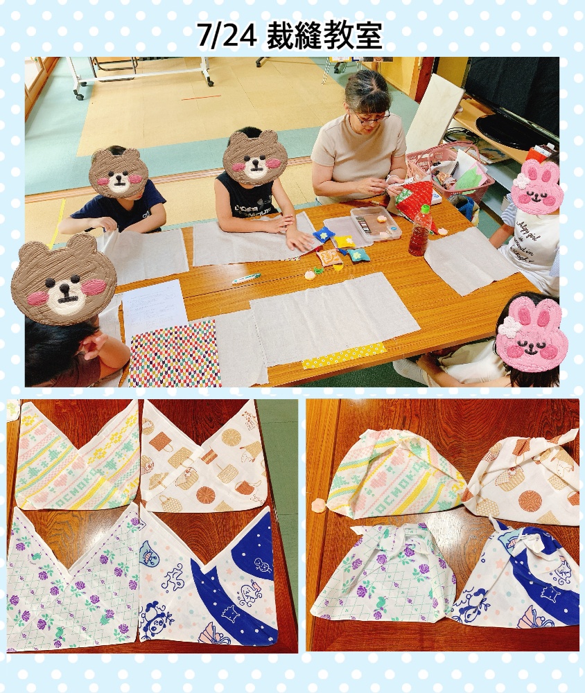 裁縫教室では、志賀先生をお招きし「あづま袋」を制作いたしました。あづま袋とは、一枚の布を直線で縫い合せ袋状にしたものだそうです。なみぬいを集中して行い、1人でできる子、先生と一緒にやる子、それぞれのレベルに合わせて丁寧に支援し、作品を完成させました♡使うのが楽しみです😊志賀先生、ありがとうございました。