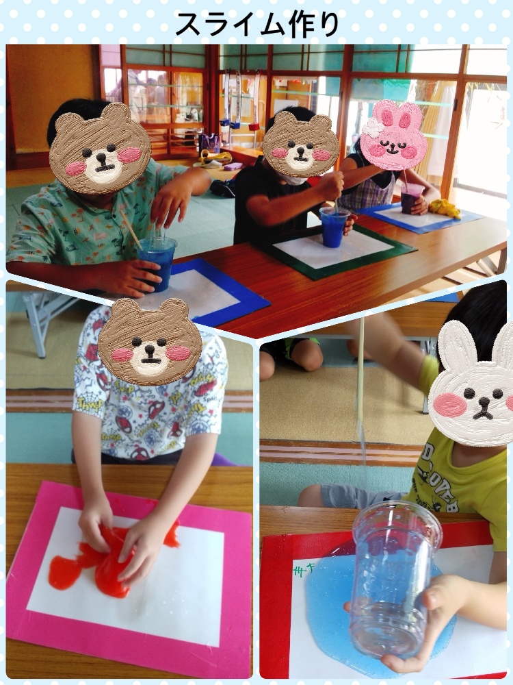 午後からは、感覚あそび「スライム作り」を行いました。液体のりと魔法の水を入れ、コネコネ!それぞれ好きな色を付け、スライムの感触を楽しみました(^-^)