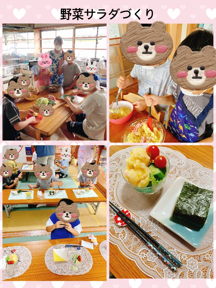 野菜サラダ作りでは、手を綺麗に洗い→消毒→マスクをしてみんなで調理しました。じゃがいもの皮剥き、マッシュしシンプルにおフランスのミネラルたっぷりの塩とマヨネーズで味付けしたポテトサラダ、、、ボールひとつ作ったのに、あっという間になくなりました♡みんなで作ると美味しさ倍増ですね!