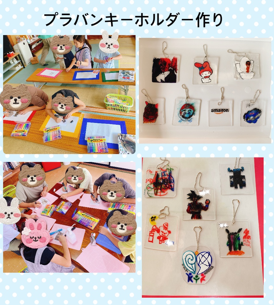 プラバンキーホルダー作りでは、それぞれ好きなキャラクターや絵を描き素敵なキーホルダーが完成いたしました。