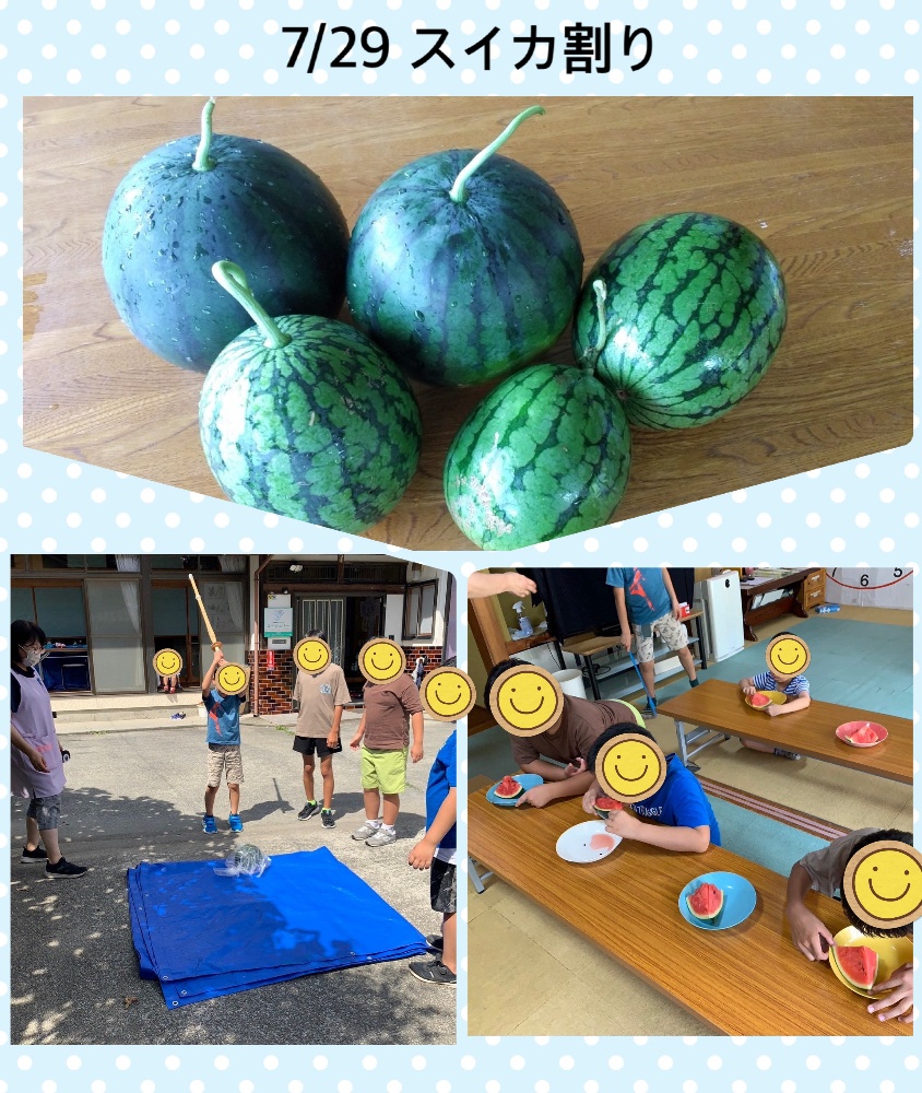 スイカ割りを通して友達と共通の目的を持って協力し合う。また、スイカのにおいや感触を感じながら見て、触って、食べて楽しみながら、五感を使って夏を感じた活動になりました。