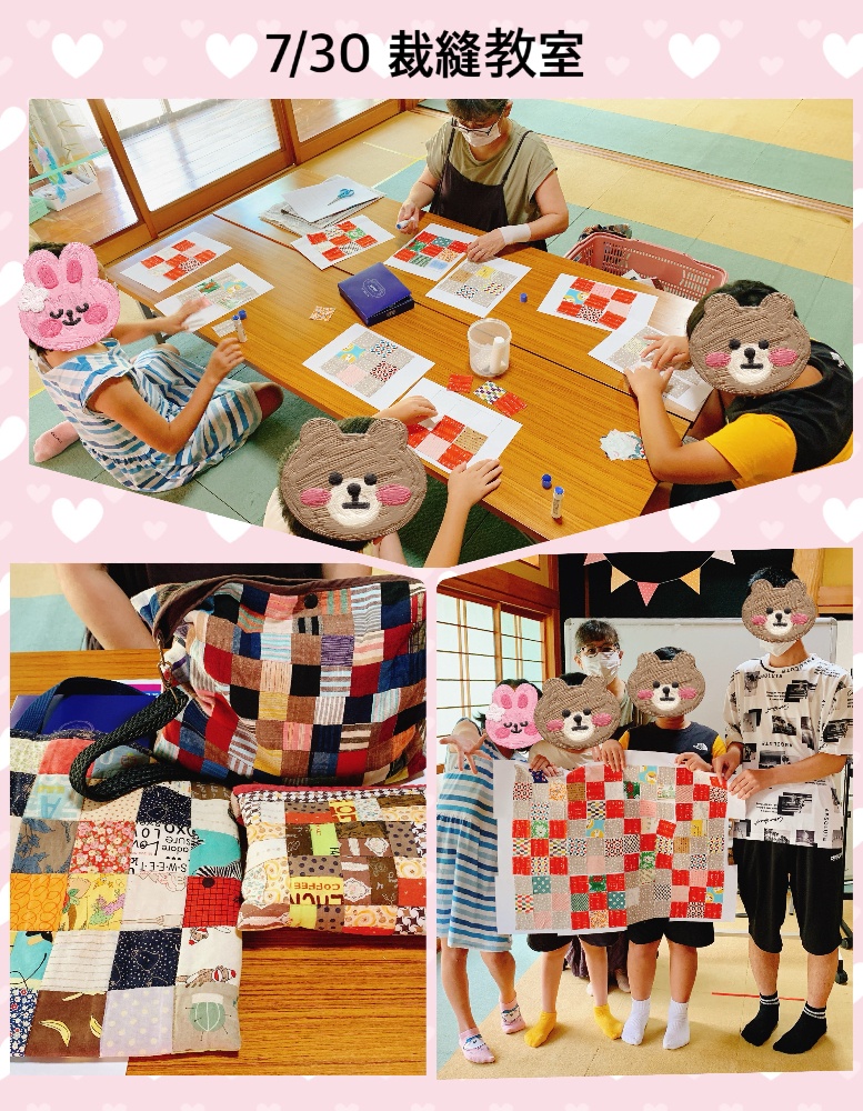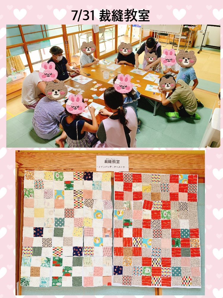 7/30(火)今回の裁縫教室では、濃淡を交互にして配色した正方形の布9枚で作る「ナインパッチ」にチャレンジしました。各々の感性で布を選出し貼り合わせ、みんなの作品を繋ぎ合わせてひとつの作品に😊赤を基調とする色鮮やかな素敵なタペストリーが完成いたしました。志賀先生の作ったパッチワークの作品にも触れ、いろんな個性ある柄が集約されると素敵な新しい形に生まれ変わる、、、私たちにも当てはまるような気がしてとても豊かな気持ちになりました。