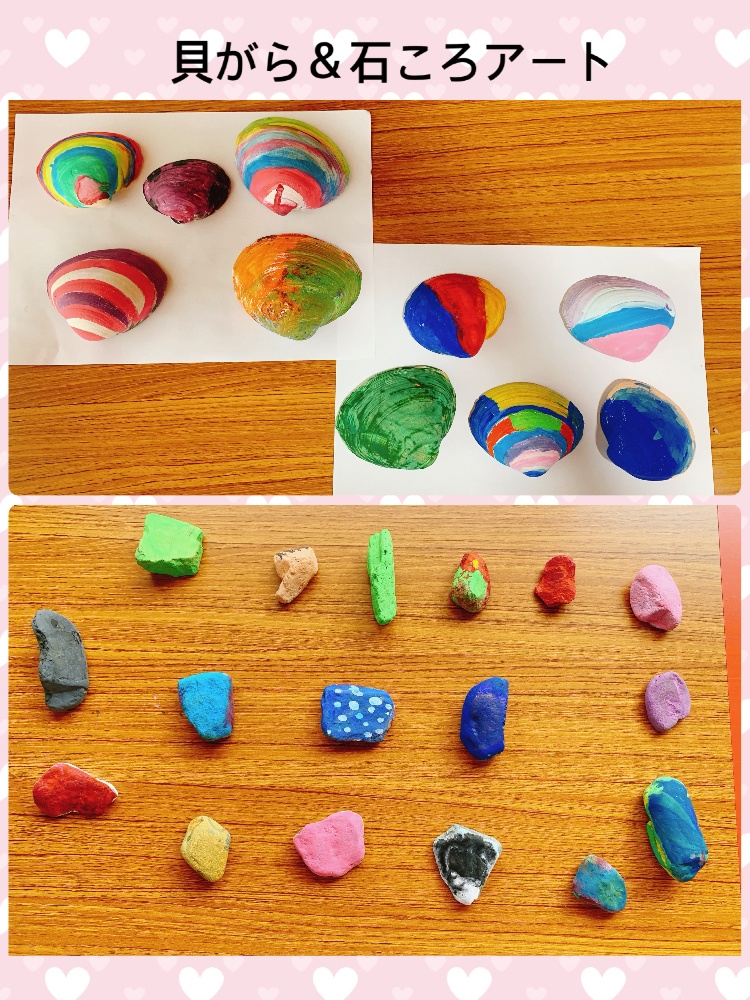 先日海で集めた貝がらと川で拾った石に色付けするアート活動をしました。それぞれの感性が発揮された個性豊かな作品が出来上がりました。お友達の作品を認め合い、褒め合いながら良好な人間関係形成に繋がりました。