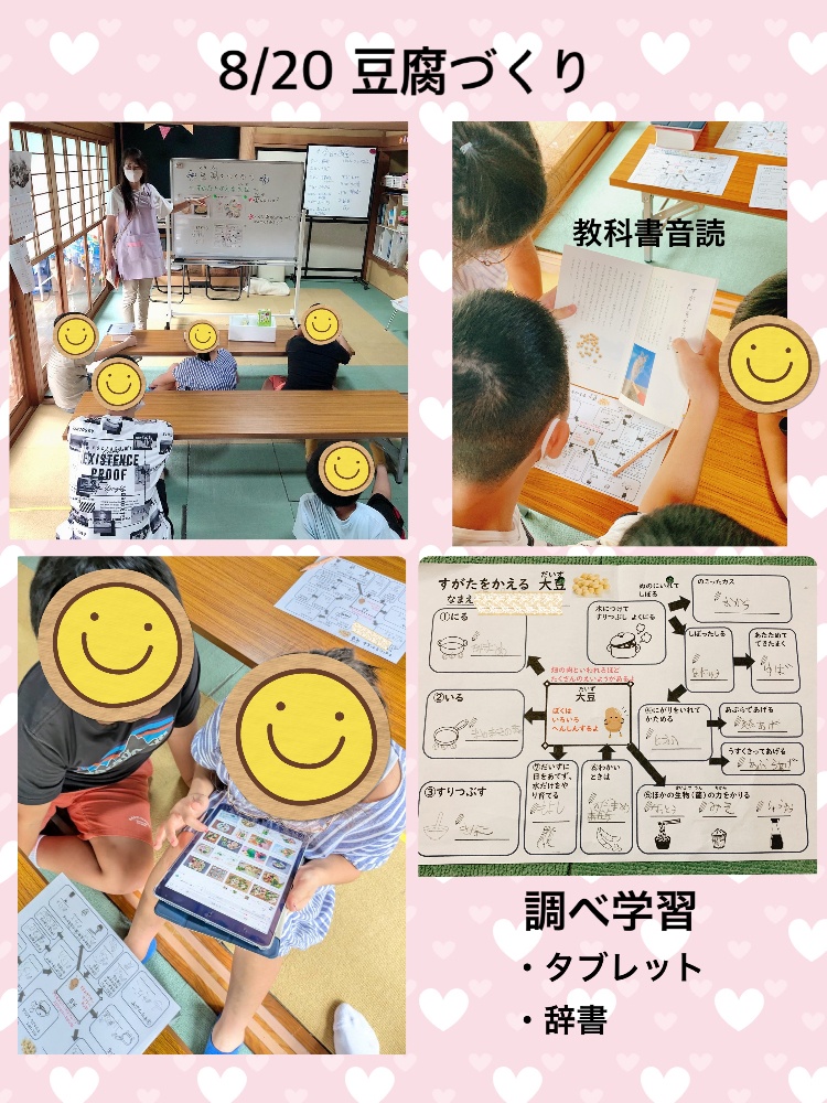 3年生の国語の教科書で出てくる「すがたをかえる大豆」にちなんで、授業の先取り活動を。みんなで、教科書を読み合いました。大豆がどのように変化するのかを、調べる学習✏️さまざまな食べ物になり、栄養価も高い大豆♡私たちの生活に欠かせない食物ですね。