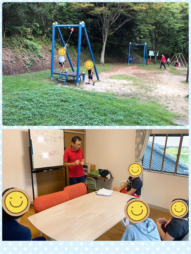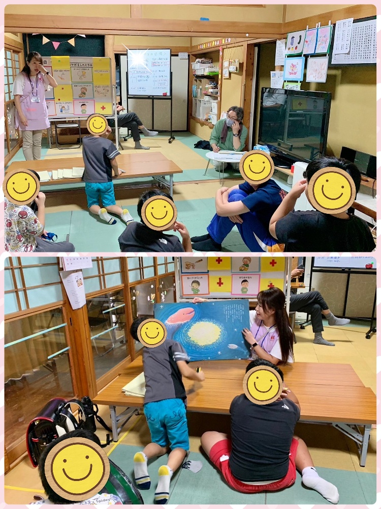 公園活動後は、SST。公園で起きた出来事を題材に、心を落ち着かせる呼吸法を学びました。