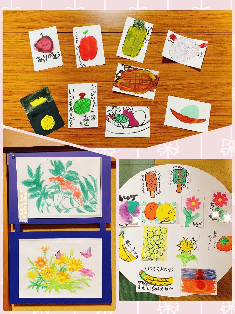 ↑こちらが、子どもたちの素晴らしい作品です。個性豊かな絵手紙、ハガキになっているので住所等書いておじいちゃんおばあちゃんに出していただければ幸いです♡