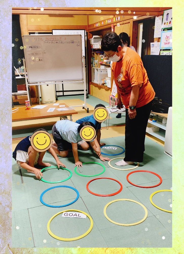 言葉の指示の通りに、右→左・・・と動作をし、プログラミングとは、コンピュータに指示を出すことを実演で学び、言語・コミュニケーションも高まった活動になりました♡