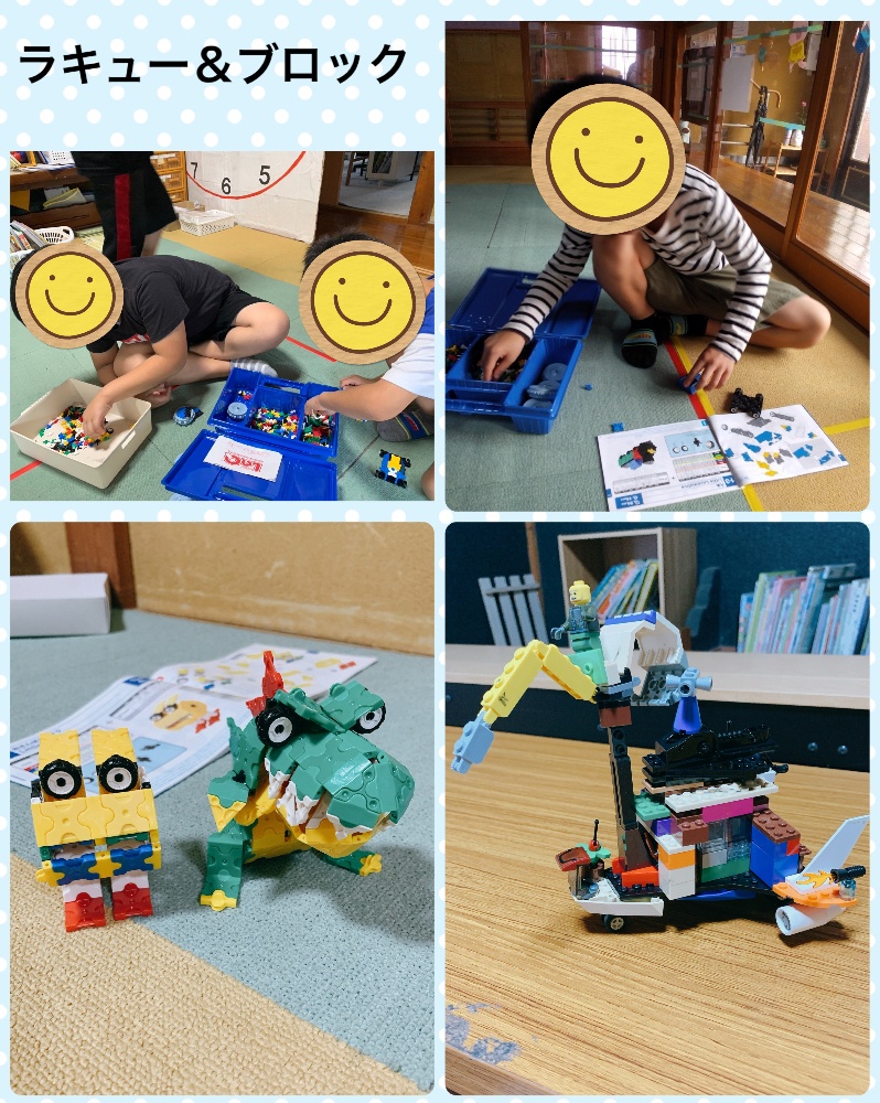 また、余暇ではラキューやブロックも大人気。ラキューは、平面、立体、球体…と作れるので、世界がどんどん広がります。説明書をみて忠実に作るお友達、自由な発想でオリジナルの作品を作るお友達、それぞれの作品を認め合い、良い人間関係を形成する手立てにもなっております。