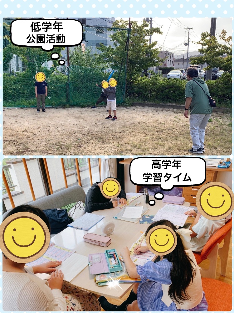 登所が早い低学年のお友達は、宿題・個別療育・余暇を行った後、外活動へ🎵新しいお友達を迎えて、野球を行いました。事前にルールを話し合い、順番を守りながら、円滑な活動ができました。