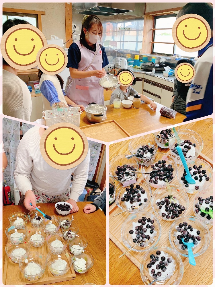 おやつには、水切りヨーグルトを作りました。ヨーグルトの水分を切ることによって、栄養価が高くなり、濃厚な食感と味わいを楽しむことができます。また、クリームチーズよりもあっさりして脂肪分が少なくヘルシー。保護者の方にいただいたブルーベリーをトッピングして美味しくいただきました♡ありがとうございました♡