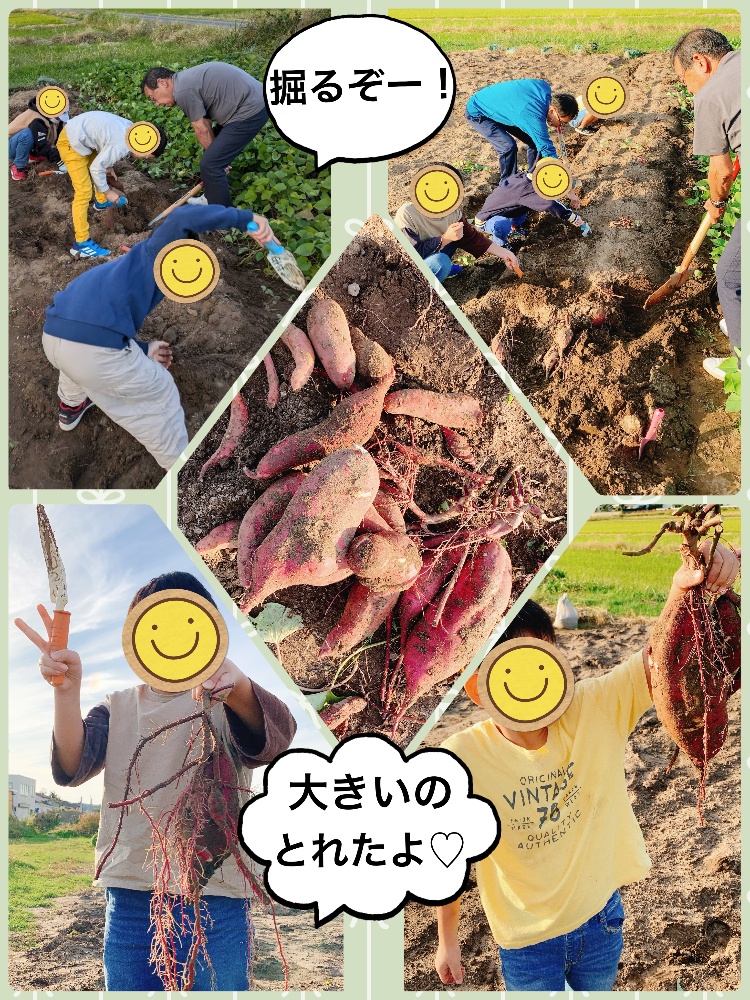 緑に囲まれた環境で、土や植物に直接触れながら、五感で自然を身近に感じる素晴らしい空間♡広大な緑に心が洗われました。道具を上手に使い無心で土を掘り起こし、さつまいも堀を堪能いたしました。道具の貸し借りでは、「貸して」「いいよ」と相手を思いやる言動がみられたり、畑を提供してくださった方に「ありがとうございました」と自然にお礼が口に出るなど、言語・コミュニケーション力も高まりました。このような機会を設けてくださり、ありがとうございました😊