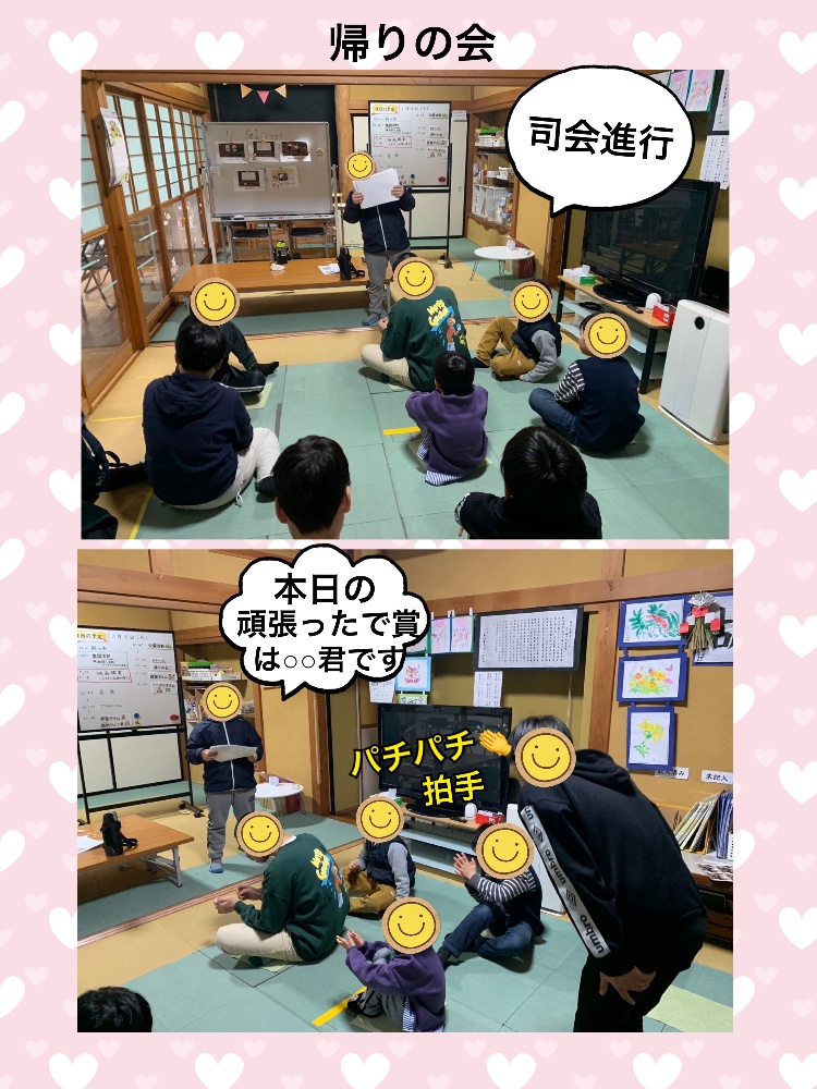 子ども主体の帰りの会では、「司会やりたい」と毎日子どもたちの発信力が素晴らしいです。今日一日の感想を述べ、お友達の良い点や好ましい事実を肯定的に評価し、それを伝える力、以前より格段に成長しております♡ まさに継続は力なりですね。2025年もコーシュリーらしい子どもたちの関わりを大切にしながら、従事して参りたいと思います。