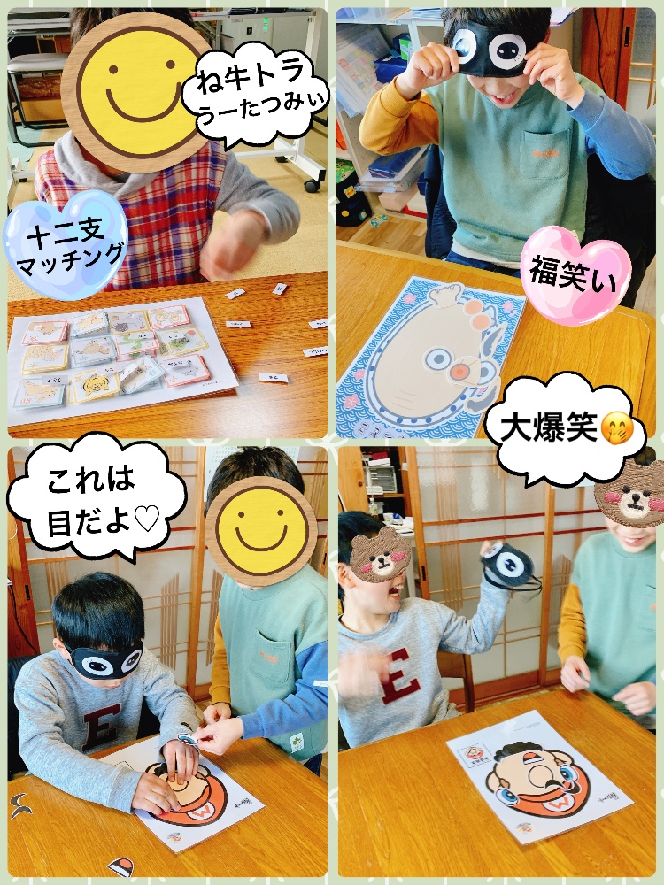 余暇では、お友達とコミュニケーションをとりながら、日本の古き良き伝承あそびを♡福笑いで、大爆笑🤭 まさに「笑う門には福来る」ですね。