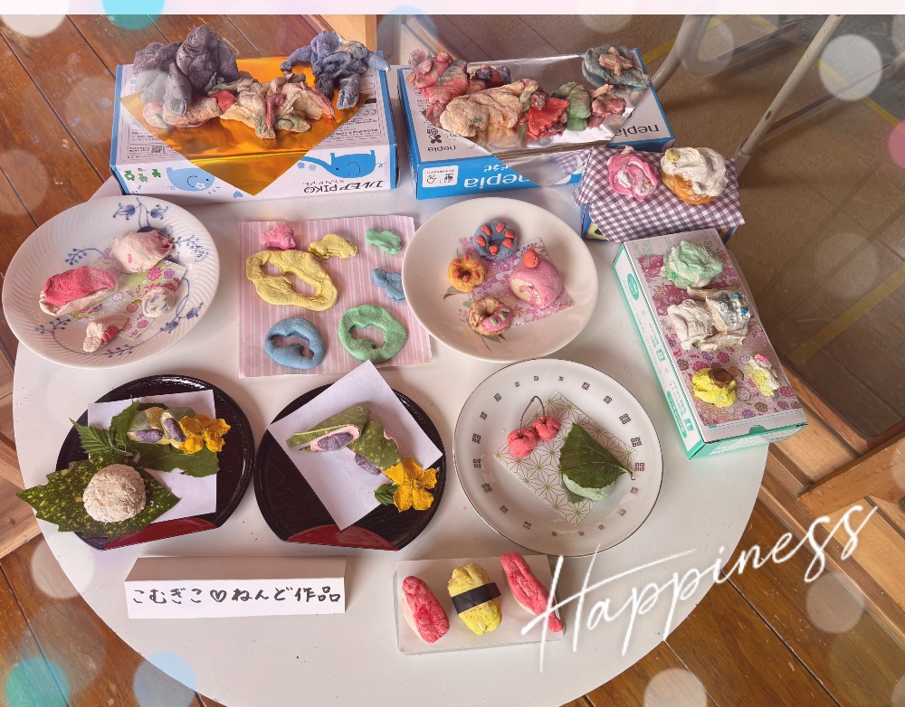 小麦粉の感触が変わっていく感覚を味わいながら、指先の巧緻性を高めます。また、混色を楽しみながら色彩感覚を養い、さまざまな色の粘土を作りました♡