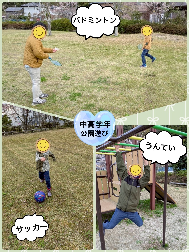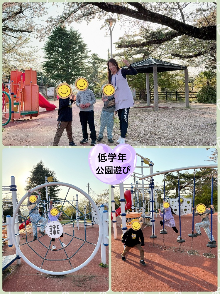 低学年の公園遊びは、固定遊具をたくさん使い、体幹を鍛え、バランスを保つ、手足の協調性、身体のコントロールなどを養い感覚統合の中でも固有覚にアプローチしております。