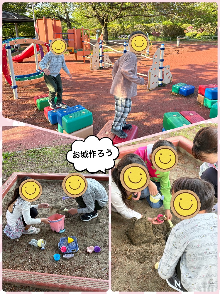 砂場では、道具を使い手先の巧緻性アップ🎵「お城を作ろう!」とみんなで協力しながらお水を汲んで運んだり、どうしたら砂が固まるか考えたり、五感を使い創造力を育みました。使った道具は、子どもたちが綺麗に洗ってお片付け♡