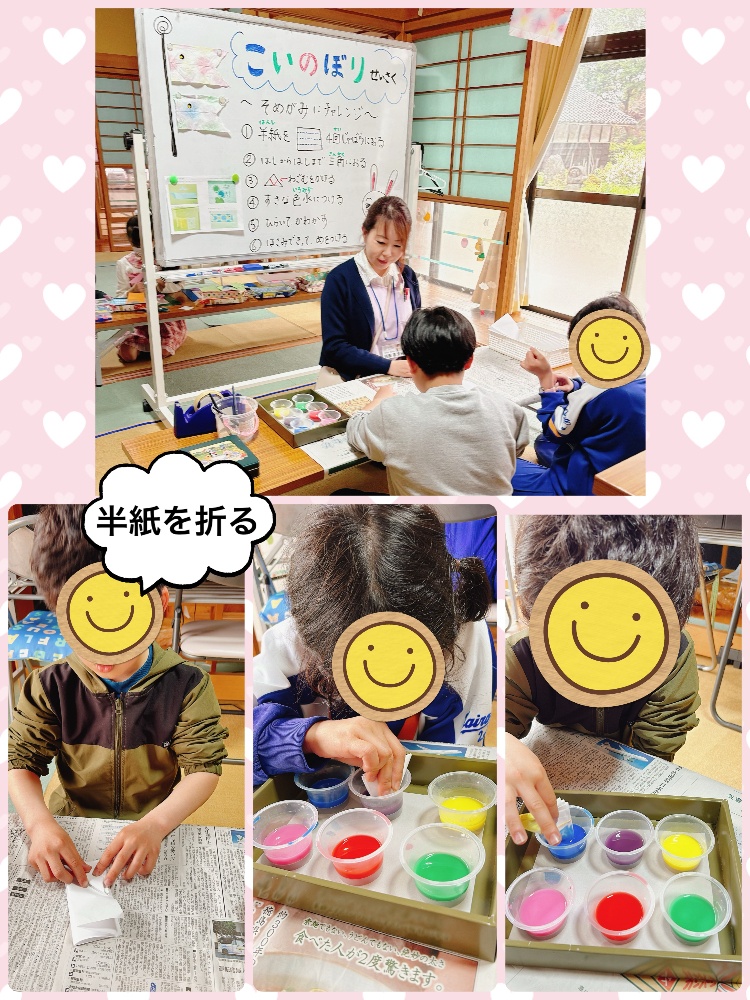 こいのぼり制作では、染め紙にチャレンジ🎵半紙を三角に折り、色水に浸し、色が染みてく様子を眺めました。そぉっと半紙を広げ、さまざまな模様のつき方や色の広がり方の違いを楽しみました。