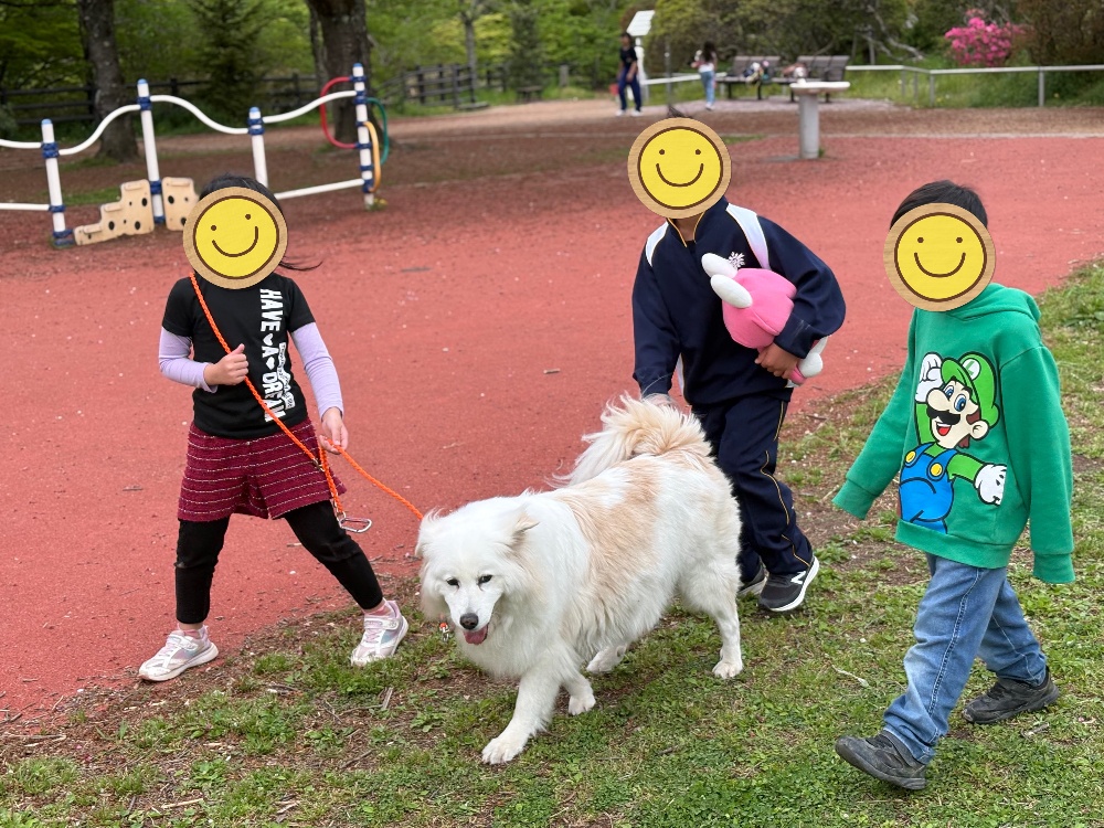 P.S. ちょうど公園にワンちゃんがいて、お散歩をさせていただきました。優しい飼い主さんに感謝です。子どもたちもニコニコ、とっても癒されました。動物がもたらす効果は絶大ですね♡