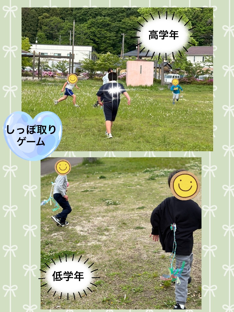 公園活動では、ルールのある遊び「しっぽ取りゲーム」を行いました。始める前にルールの確認☝️ボーディイメージを高め、目と手の協調性アップ🎵ルールを守りながら、広い敷地を走り回り、発散いたしました。