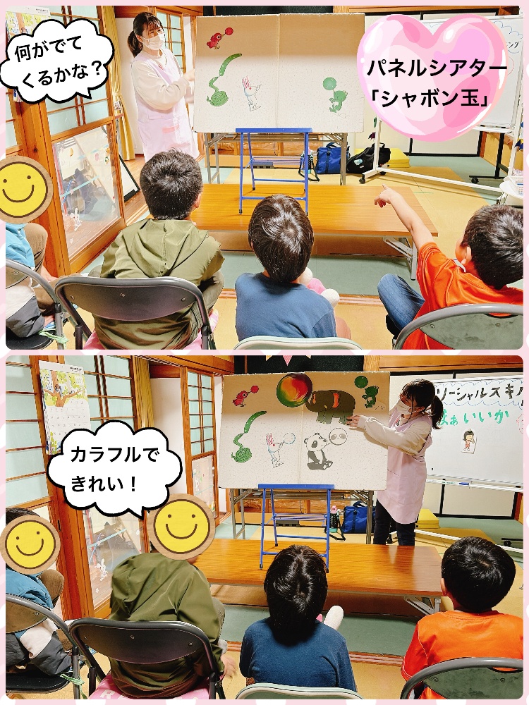 パネルシアターでは、曲に合わせてさまざまな動物たちが登場し、いろんな色のシャボン玉がきれいな作品でした。聴く力を養います♡
