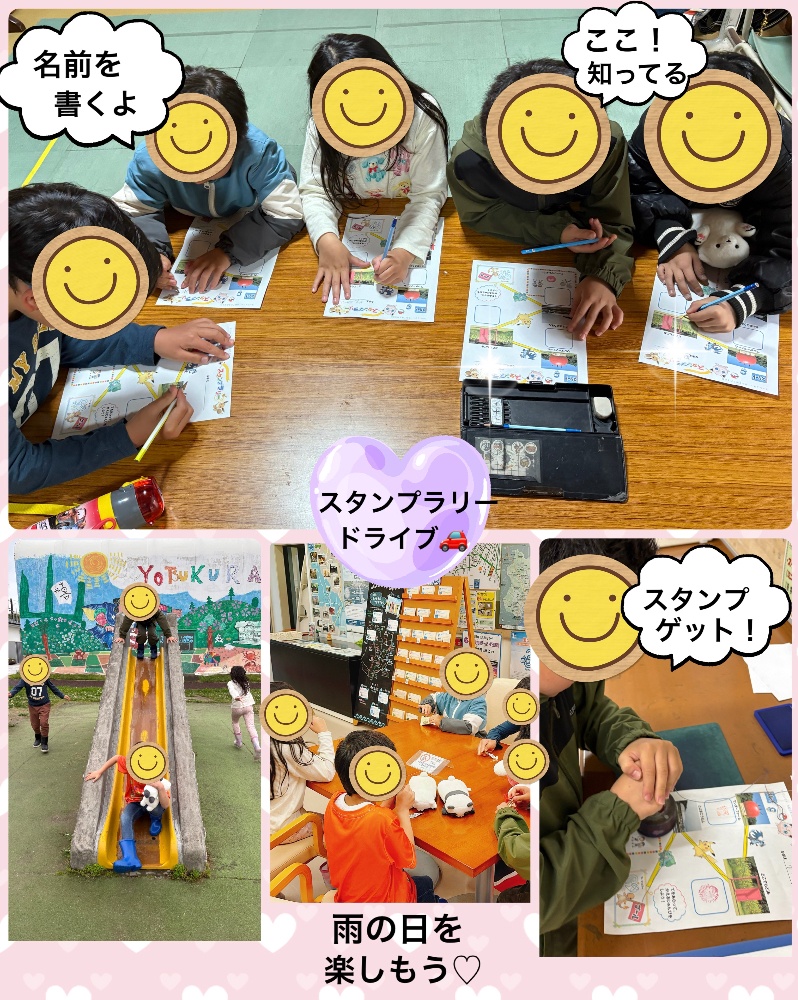 お次はみんな大好き公園活動!最近金曜日は雨が降ることが多いですね。そんなときは、スタンプラリードライブ🚗