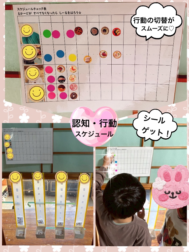 さて、4月から新しいご利用の低学年のお友だちは最初はスケジュール通りに切替するのが困難でした。しかし、スケジュールがなくなったらシールを貼るシステムにしてから自らスケジュールを確認するようになり、切替もスムーズに♡視覚的に分かりやすいものを提示すると効果的ですね♡