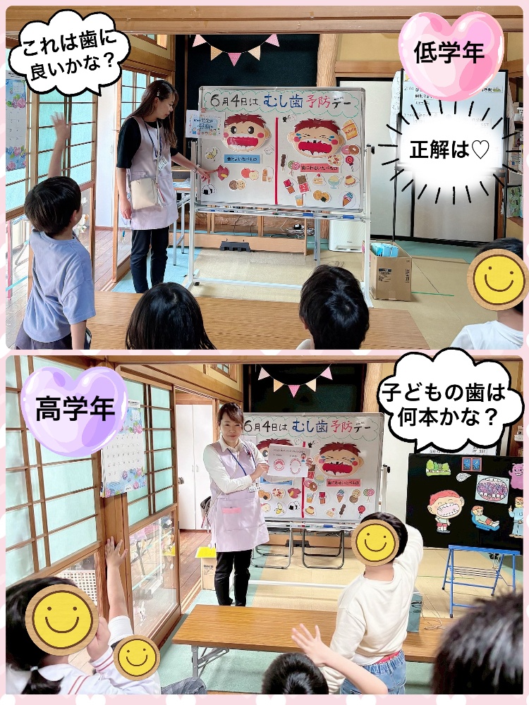 次に低学年と高学年に分かれ、歯に良い食べ物と悪い食べ物に仕分けしました。「チョコレート大好き」と好きなおやつを話ながら仕分ける低学年😊「砂糖が入ってて甘いのは歯に良くないな」などと理由を言いながら仕分ける高学年👏