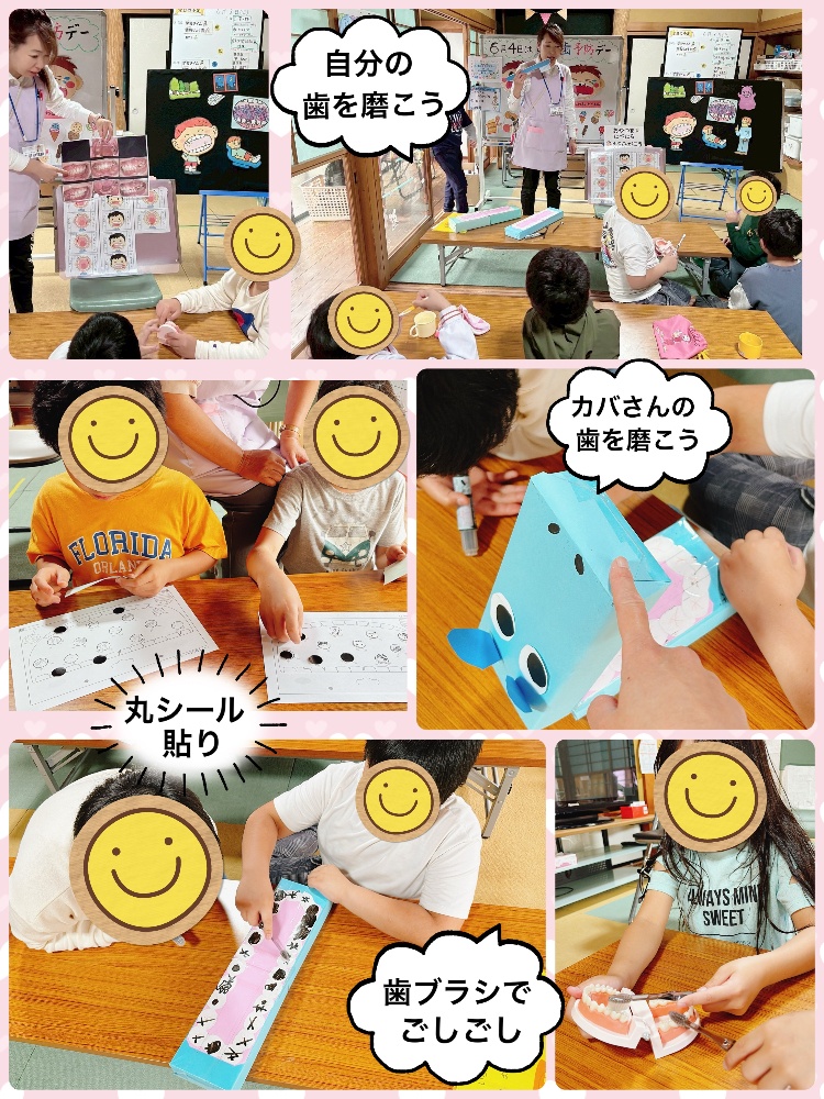 虫歯の丸シールを貼ったり、カバさんの汚れた歯をきれいにし、歯の模型を使って歯磨きの練習♡最後に、手順書を見ながら自分の歯を丁寧に磨きました。工程ごとに磨くとあっという間に3分が経過し、「歯がツルツルになって、スッキリしたー」と笑顔に♡みんなで磨くと楽しいですね😊