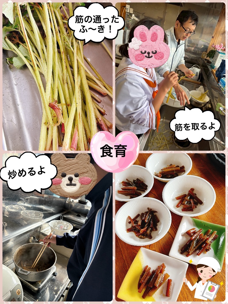 アクを抜き、筋取りで手先の巧緻性を高めながら、甘辛く炒めて煮ました。はじめて食べる子もいましたが、「美味しい」と大盛況でした♡