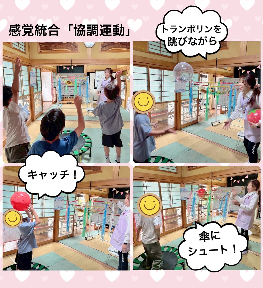 感覚統合では、トランポリンを使いバランス感覚を養い、固有覚と前庭感覚の統合を促進します。さらに、跳びながらボールをキャッチ&シュートで協調運動も鍛えます。順番を守り、他者意識をし円滑なコミュニケーションをとりながら活動いたしました。