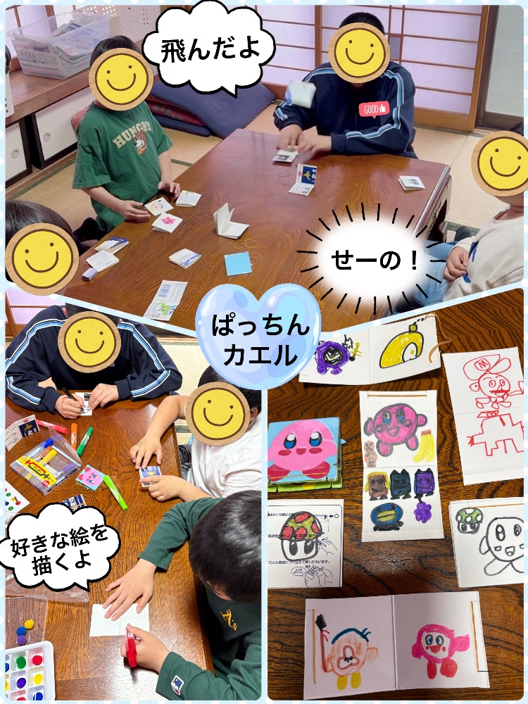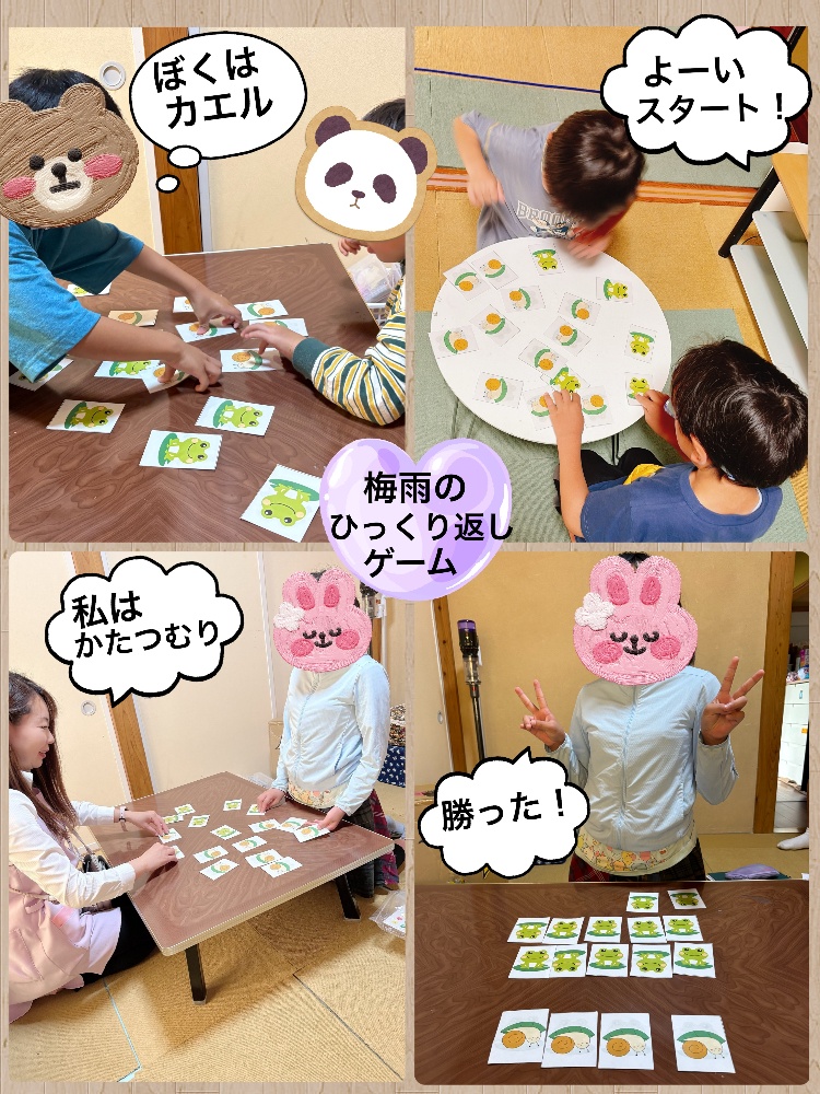 対戦では、梅雨のひっくり返しゲームで盛り上がりました🤭簡単なルールで、タイマーを使い時間の切替の訓練にもなります。負けても爆発することなく「まぁ、いいか」と気持ちの切替、大切ですね♡