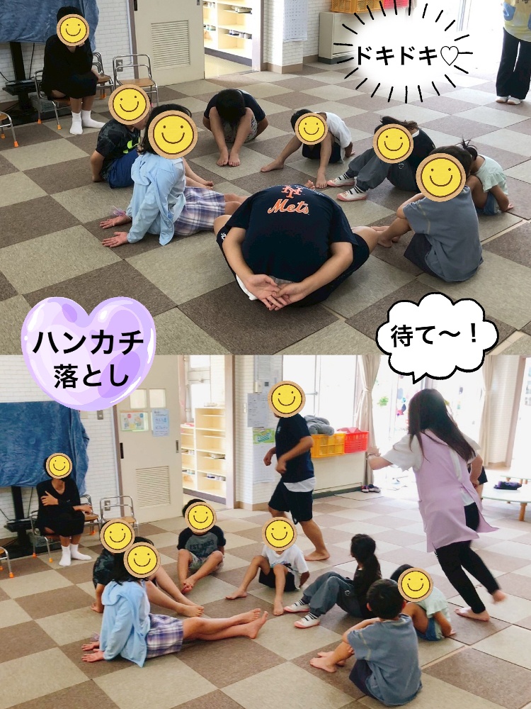 少し静の時間を♡円になって、心を落ち着かせてからの⤴︎、、、「ハンカチ落とし」🤭