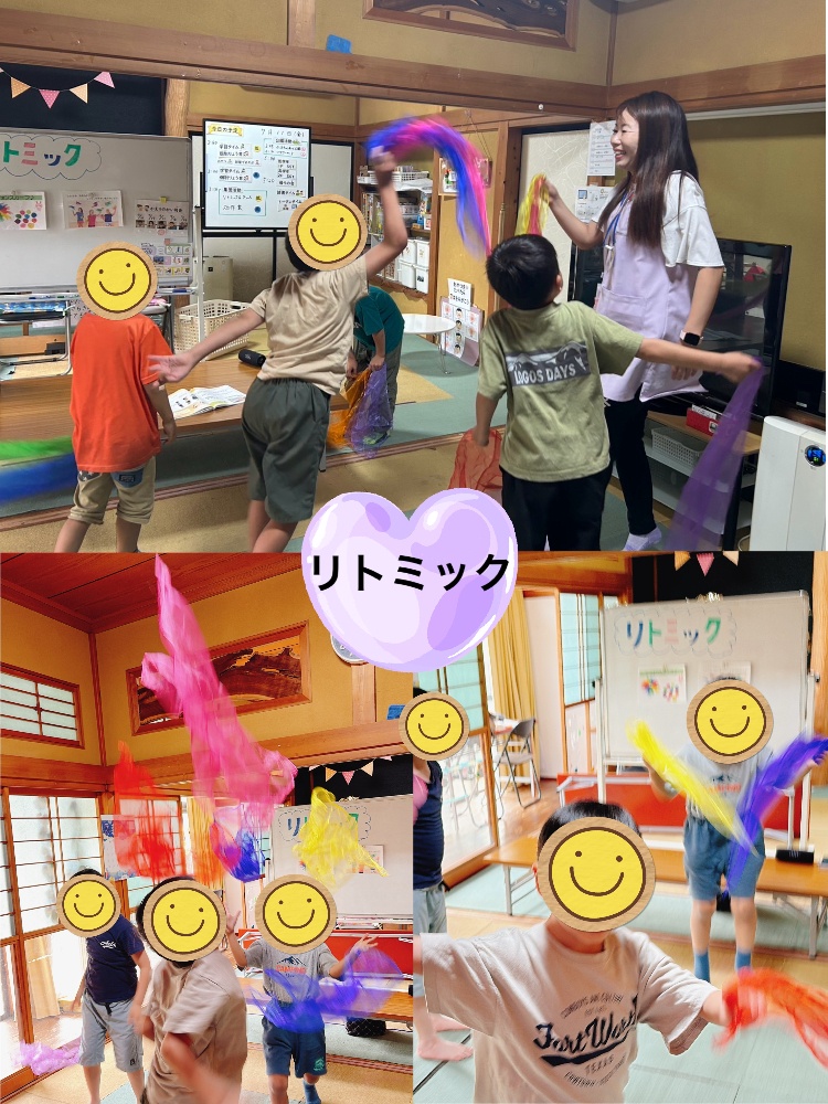 リトミックでは、夏の涼しげな曲に合わせて、シフォンスカーフの柔らかな感触を味わいながらゆらゆらゆらし、身体を動かしました♡