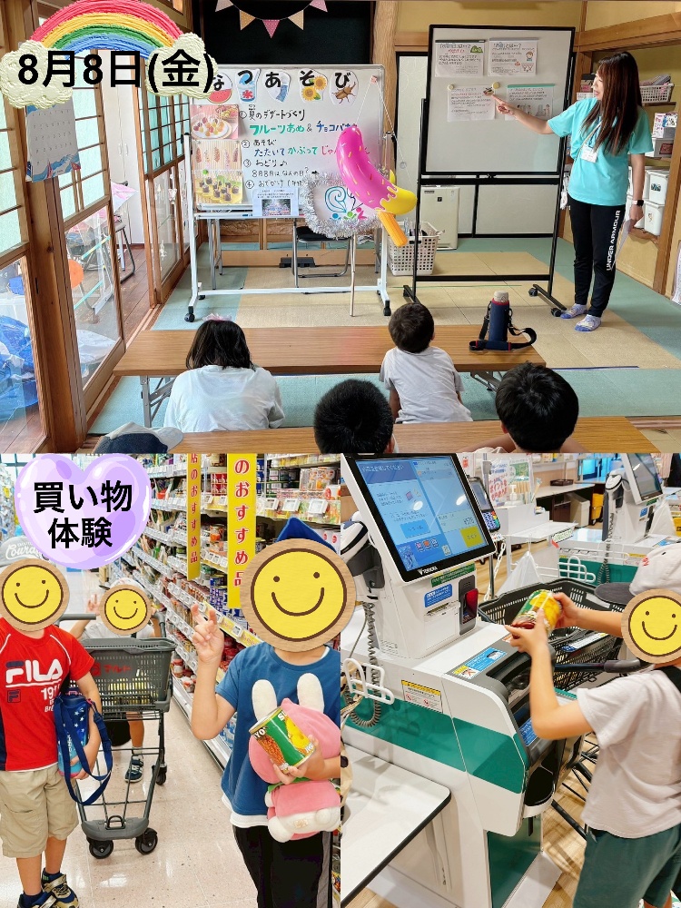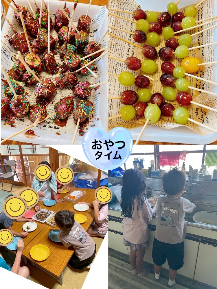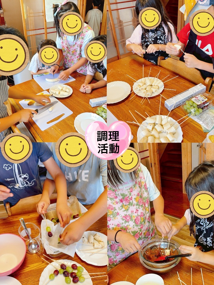 ⭐︎8/8(金)⭐︎七夕にちなんで、「なつあそび」として屋台で大人気のチョコバナナとフルーツ飴づくりをいたしました。お集まりでは、日本の伝統的な行事「お盆」とは何か、またお盆休みの過ごし方のお話をしました。