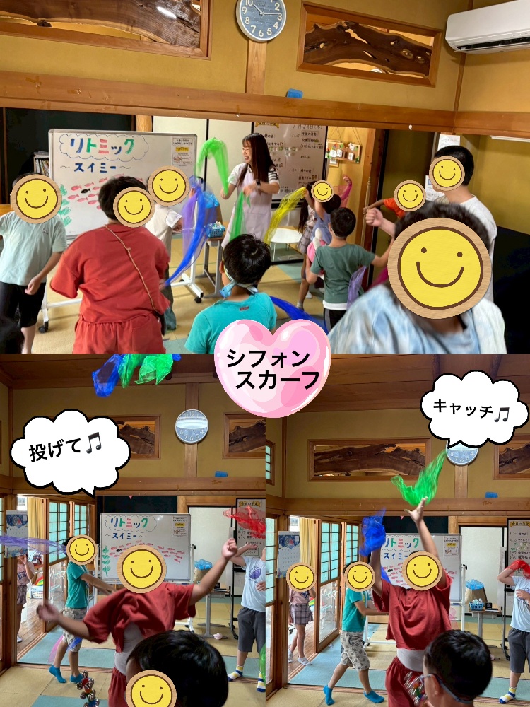 スイミーの曲に合わせ、揺らしたり、スイミーを泳がせたり♡クラゲにもチャレンジ!みんなで息を合わせ良いコミュニケーションがとれた活動になりました。