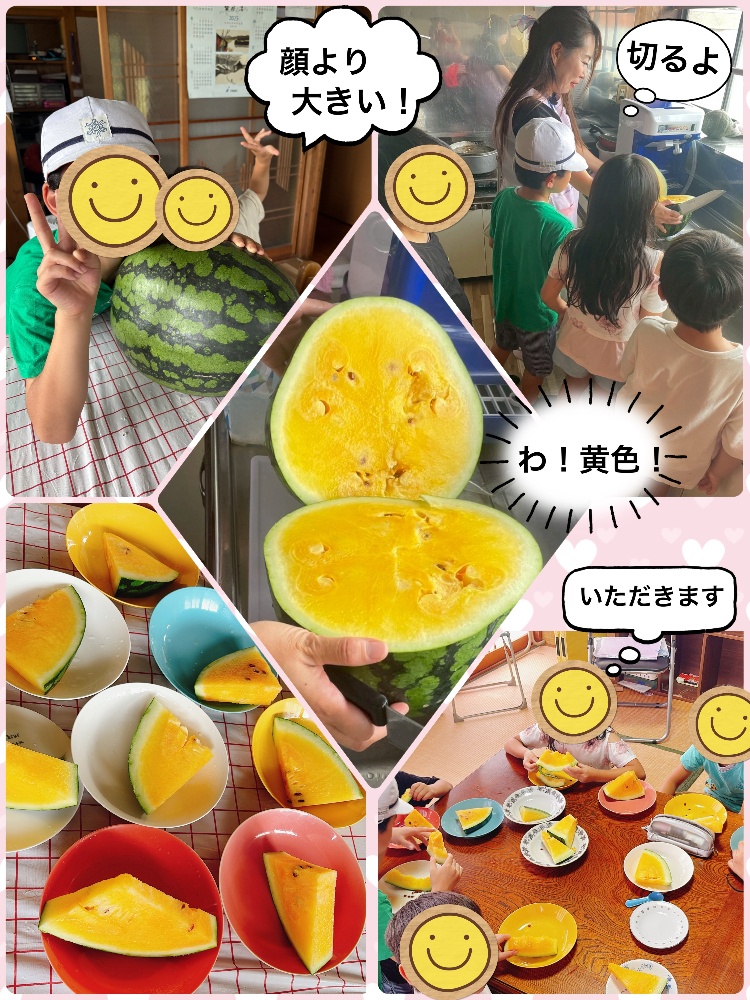 おやつには、保護者さんが作ったスイカをいただきました♡顔より大きく子どもたちも大喜びでした。切ってみたら、なんと「黄色!!」しかも甘くて美味しかったです。貴重なスイカを提供していただきありがとうございました😊