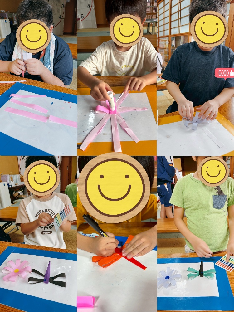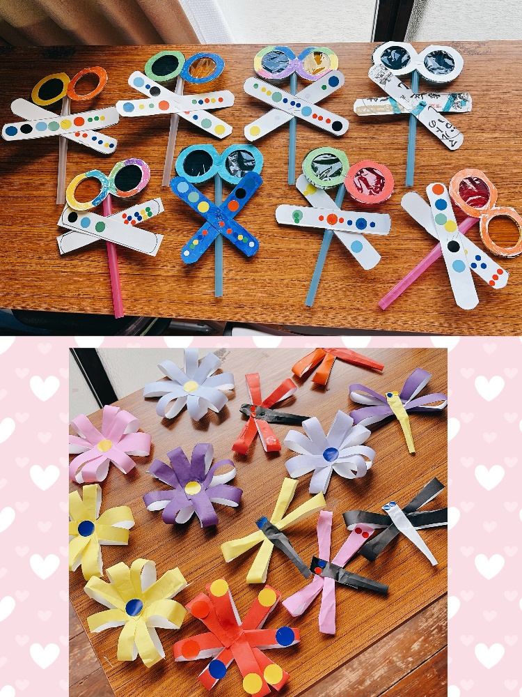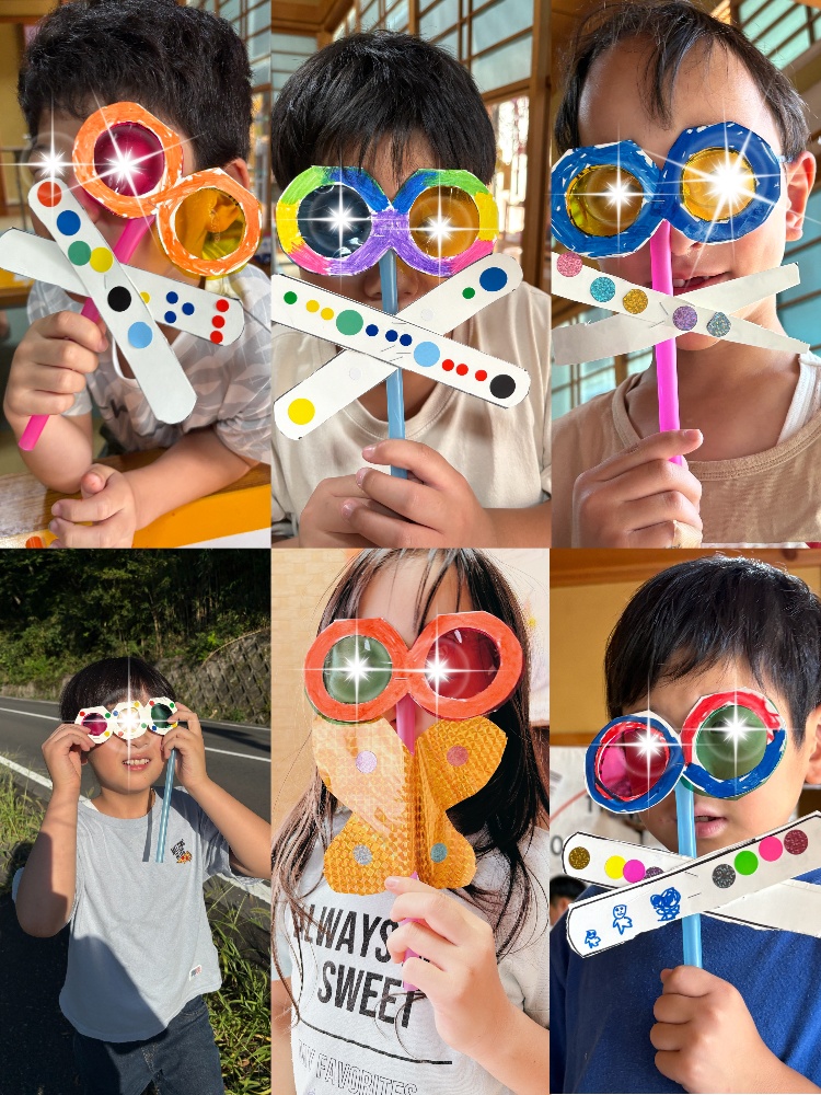 まずは、トンボのメガネ🥸をつくりました。少し硬めの素材 牛乳パック切りにチャレンジ✂️苦戦しながらも手先を上手に使い切っておりました。各々メガネを好きに色取り、カラーセロファンを貼りつけ完成♡