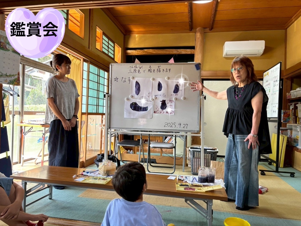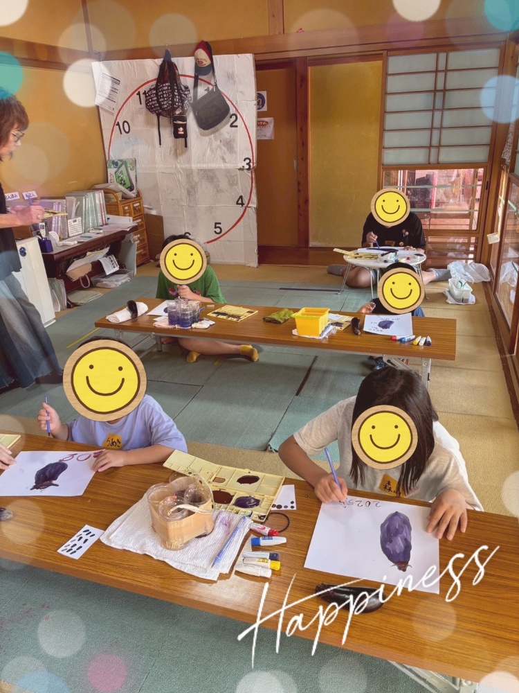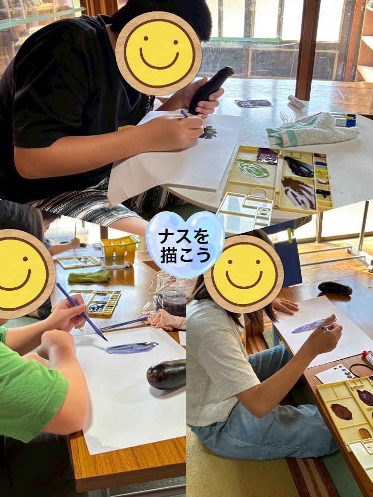 実物のナスを見ながら絵を描きました。ヘタと実の部分の微妙な色合いを工夫しながら、各々の感性で取り組む姿勢が素晴らしい👏