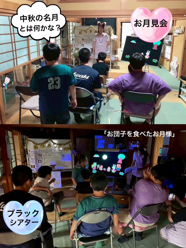 ブラックシアターでは、「お団子を食べたお月様」鑑賞会🎵いたずら好きのくいしんぼうのたぬきくんが起こしたユニークな珍事件を優しく受け止めるお友だちの話♡