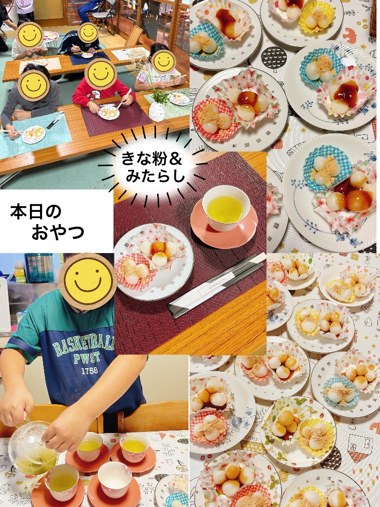 お団子づくりでは、まず手をきれいに洗います。保護者様に寄付いただいた上新粉に水を入れ、耳たぶの固さになるまでこねる♡粉がまとまっていく感触を味わう感覚あそび☝️感触を楽しみながら五感を刺激すること、手先や指先の巧緻性を高める♡また集中力や創造力を養い、お友だちと協力して完成させることで社会性も育む活動になりました😊