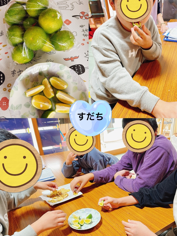 保護者の方にいただいた旬な「すだち」♡ 香り高く、風味豊か😊切ってみんなで匂いをかぎ、食してみました。味の感想を伝え合い楽しいおやつ時間になりました。いつもいろんな食材を提供いただきありがとうございます♡