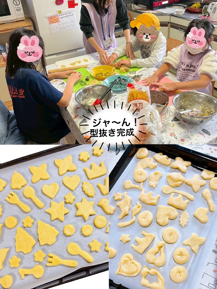 めん棒で生地を伸ばす工程では、なかなか丸く均一に伸ばせず何度もチャレンジする姿がみられましたが、自分なりのコツを掴んだようです👏型抜きを使ったり、オリジナルのクッキーを作ったり、発想力が素晴らしいですね♡