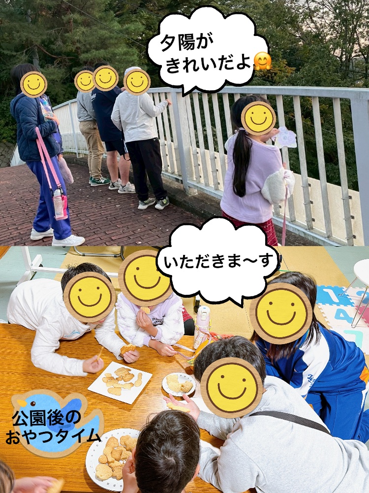 戸外活動では、みんなで夕陽を眺めました♡赤やオレンジの暖色系の光は、心を穏やかにし、副交感神経を刺激してストレスを緩和する効果もあるそうです🤗公園後、出来上がったクッキを食べハッピータイム♡