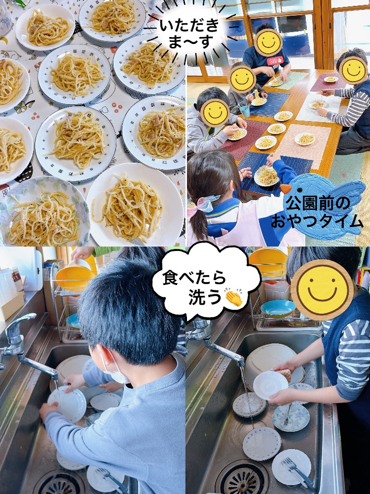 結果的に水でも美味しく作ることができ「美味し〜」とみんな完食でした🤭食べたらお片付けし、戸外活動前に腹ごしらえをし、公園で体を動かし発散しました♡