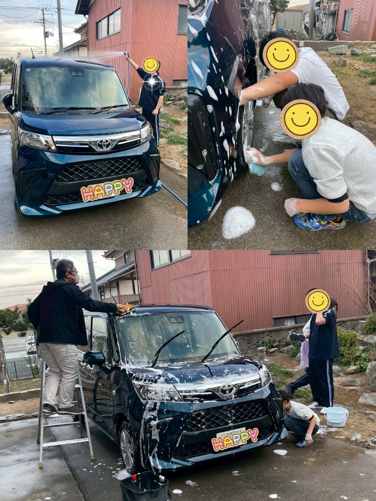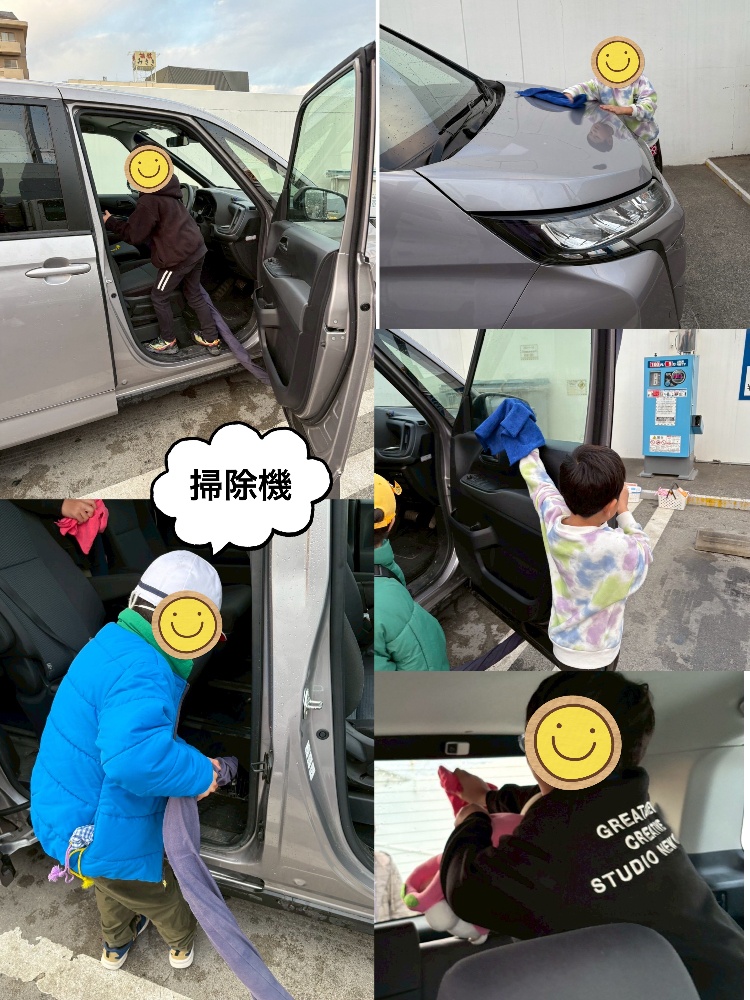 無料の拭き上げタオルをお借りして、みんなで一生懸命車を拭きました。巨大掃除にテンションがあがりみんなで交代で車内をキレイにいたしました😊キレイになった車は「気持ちがいい〜」と大満足でした。